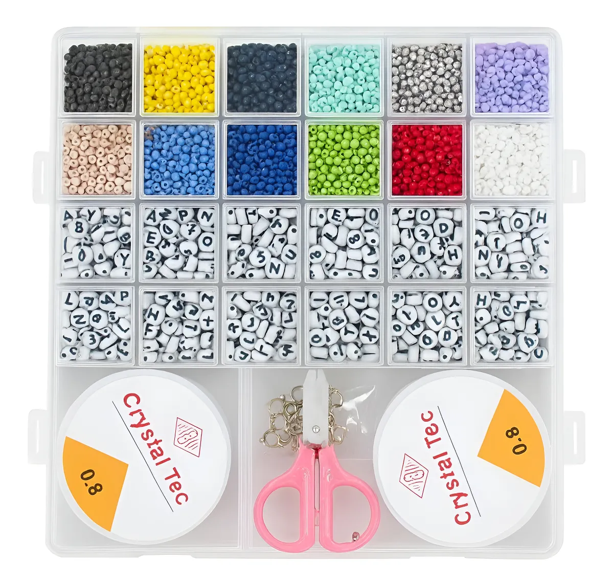 El estuche mide 20cm de largo x 19cm de ancho x 1,5cm de alto.Incluyen: 24 divisiones de mostacillas chicas surtidas, tijera, ganchos para bijouterie y rollos de tanza.